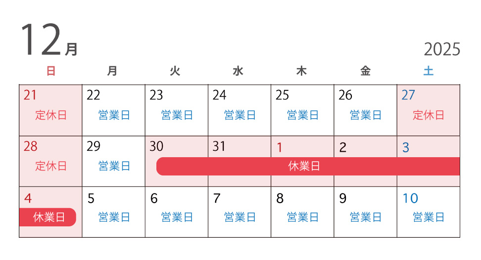 年末年始休み期間:2025年12月30日(火)~2026年1月4日(日)